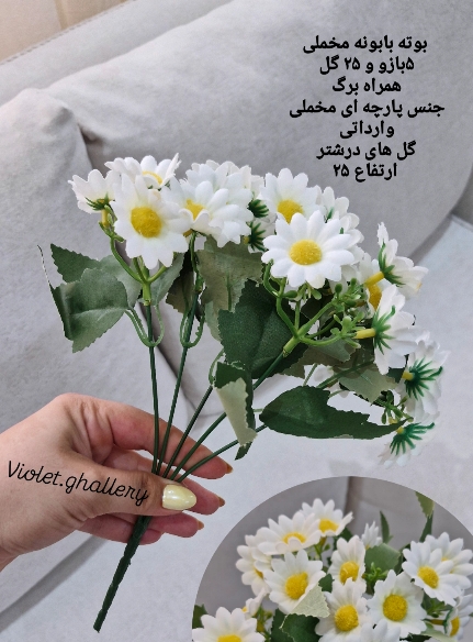 گل مصنوعی بوته بابونه وارداتی و پارچه ای خیلی طبیعی هستش و قابل شستشو حجم خوبی داره وبرای گلدان کوچیک و بزرگ مناسبه