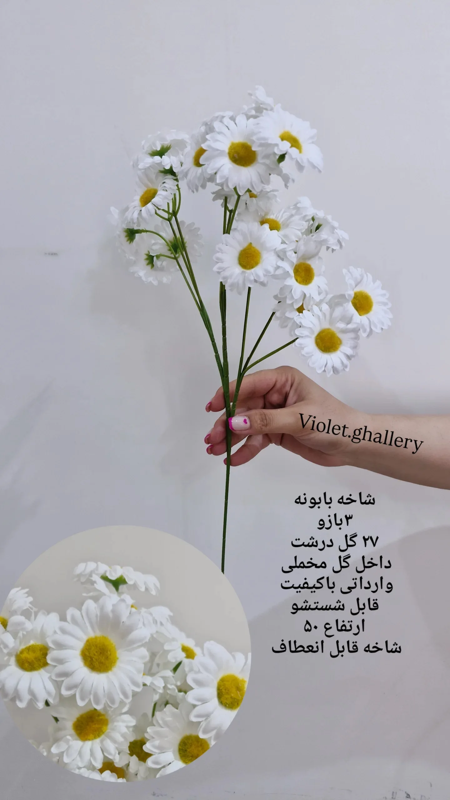 شاخه گل مصنوعی بابونه پارچهای وارداتی (۲۷ گل – ارتفاع ۵۰ سانتیمتر)