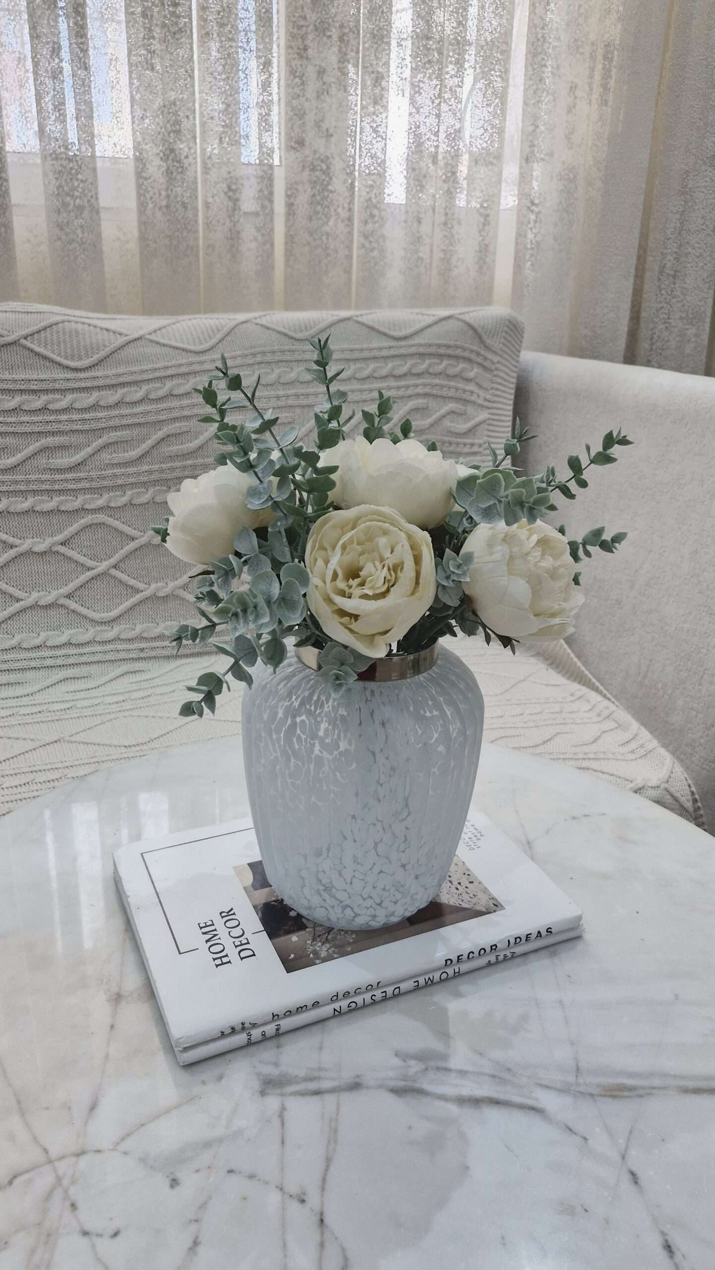 گلدان به همراه شمشاد برفی و بسته پیونی